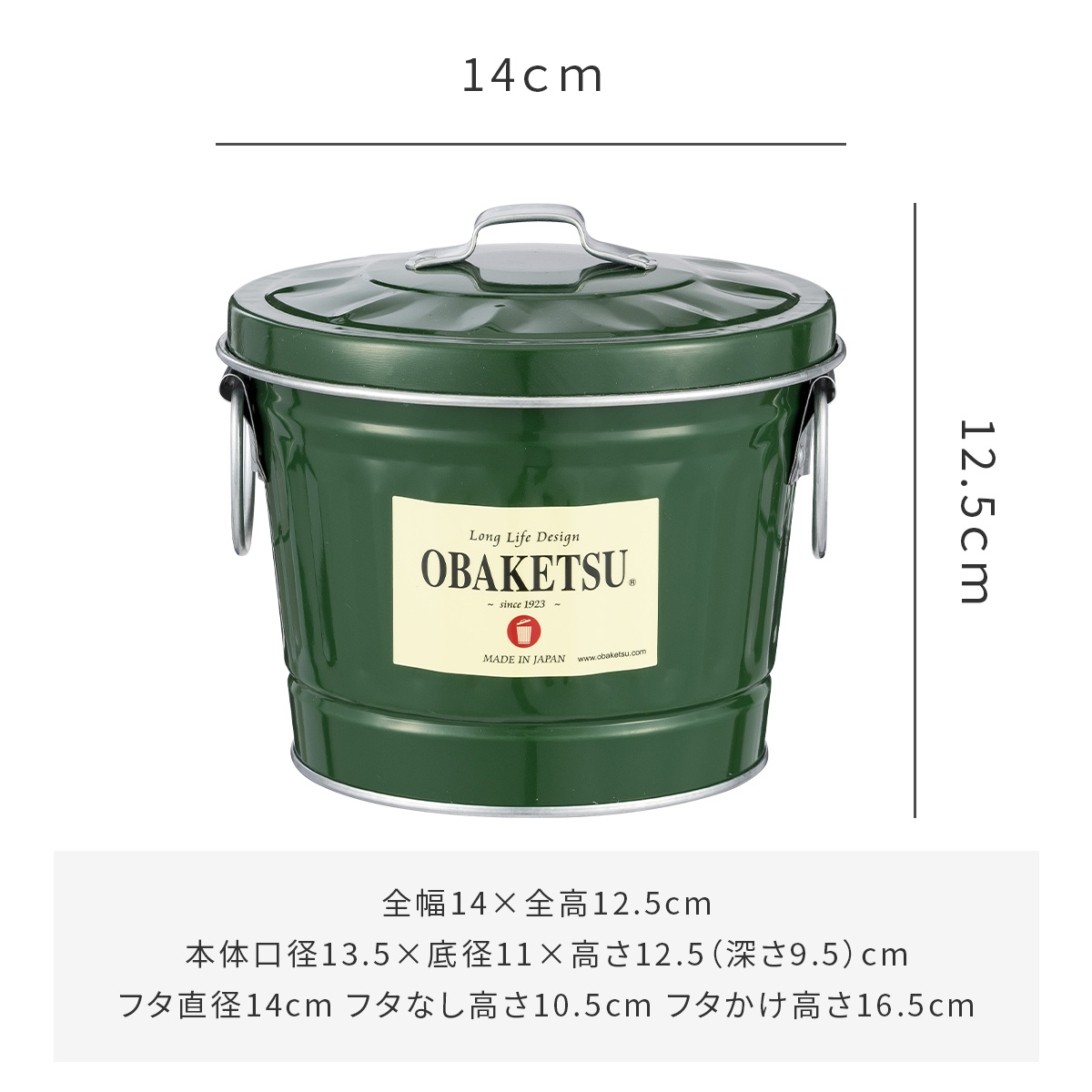 本体口径13.5×底径11×高さ12.5(深さ9.5)cm フタ直径14cm フタなし高さ10.5cm フタかけ高さ16.5cm |